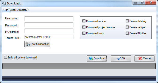 Starts the download. All project files required are compressed into the project.prj file and then loaded onto the target system via FTP.